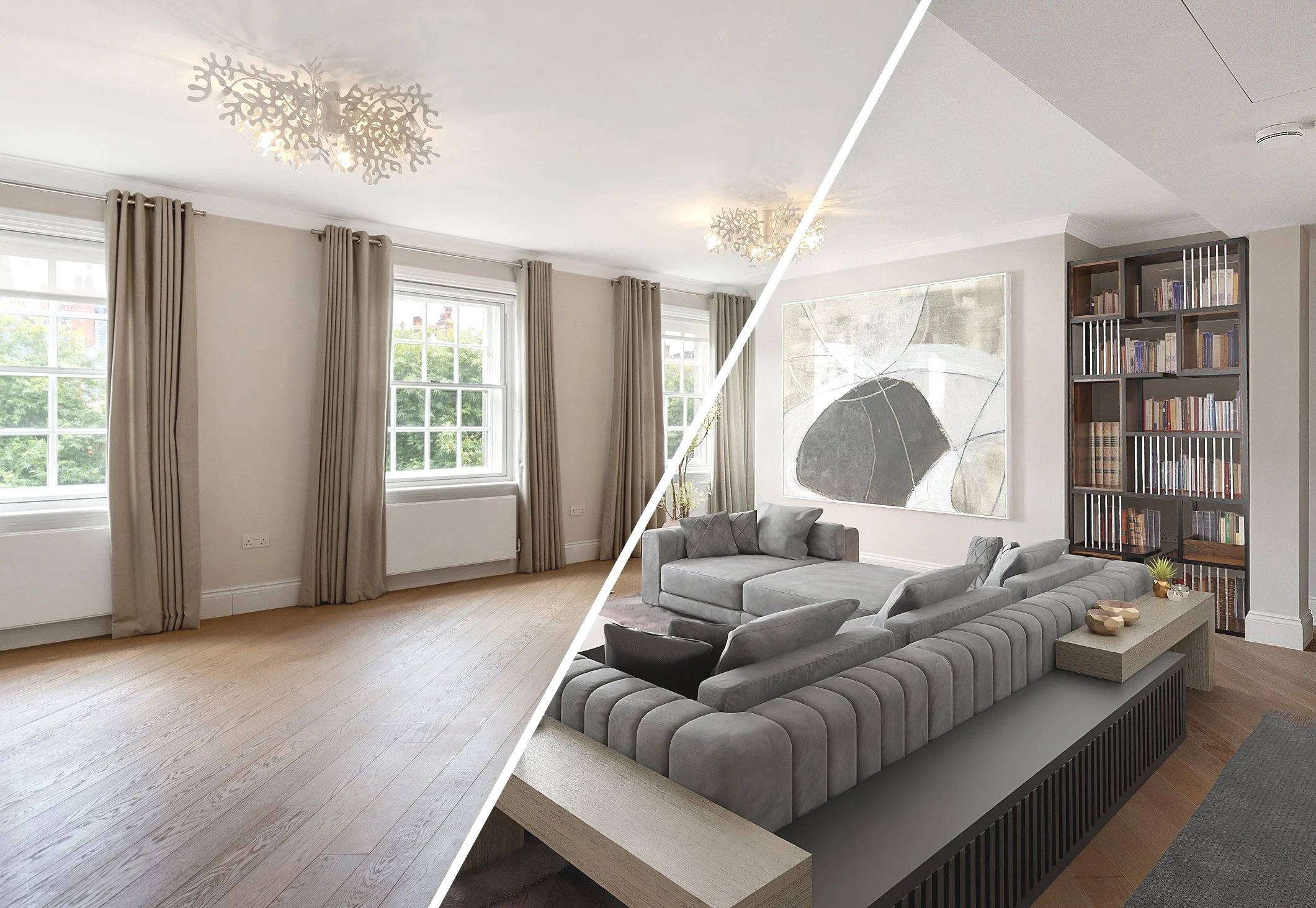 Our virtual staging service transforms empty or tired rooms into beautifully furnished spaces